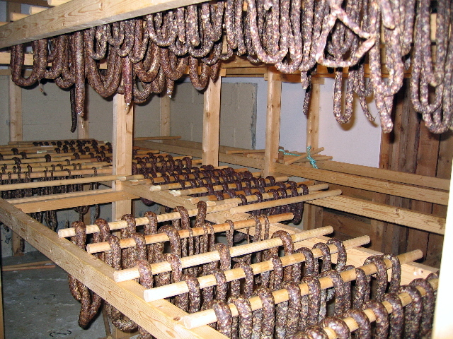 høvelege lengder. Pølsene vert så hengde opp natta over, før dei